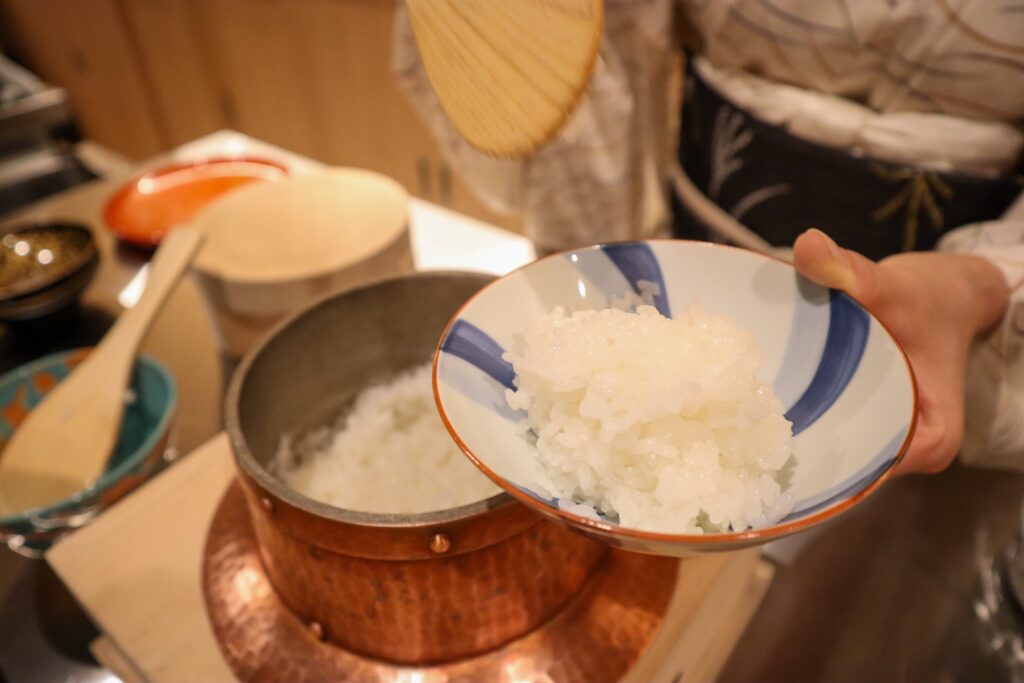 焼き物、羽釜ご飯、汁物