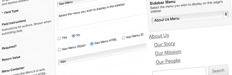 Add Navigation Menus to Advanced Custom Fields (ACF) with the Nav Menu Field plugin! This plugin adds the Nav Menu Field type to ACF (version 5 & 4), allowing you to select from the menus you create in the WordPress Admin backend to use on your website’s frontend.