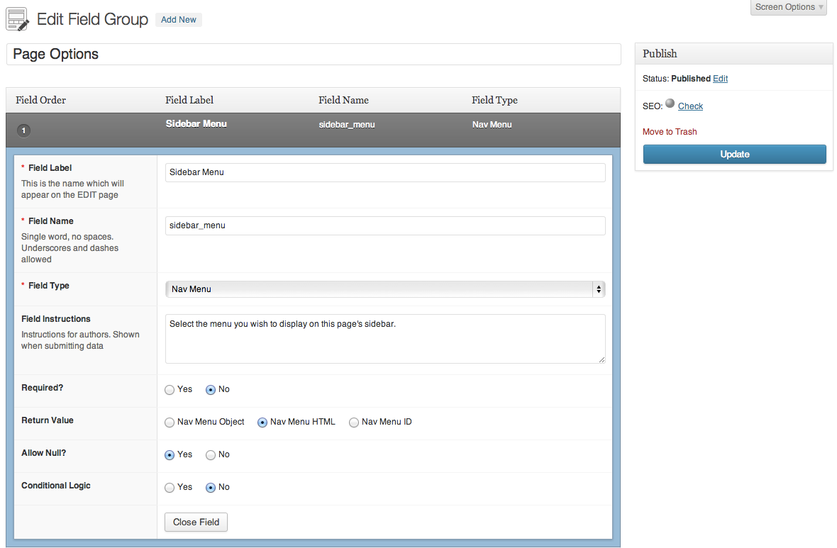Side Menu(this will cause the Field Name to beside_menu) - Set the Nav Menu’s Return Value to