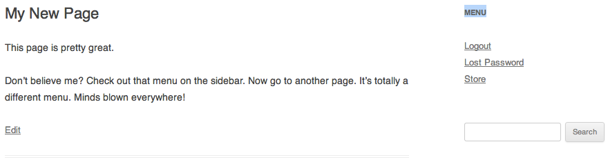 Finally, create or edit a page, select a menu in the Side Menu field, and view the page to see that menu in the sidebar!