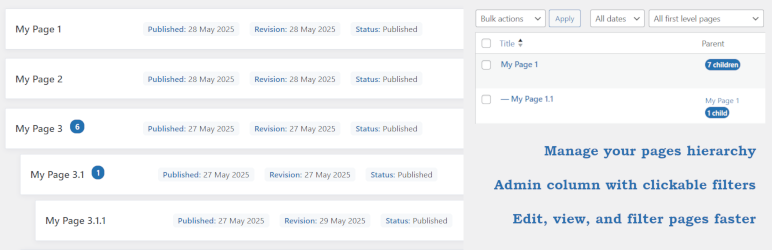 Managing complex page hierarchies in WordPress can be a challenge. Easy Hierarchy streamlines your workflow by adding powerful tools to the admin area, making it simple to filter top-level pages and visualize parent-child relationships for every item.