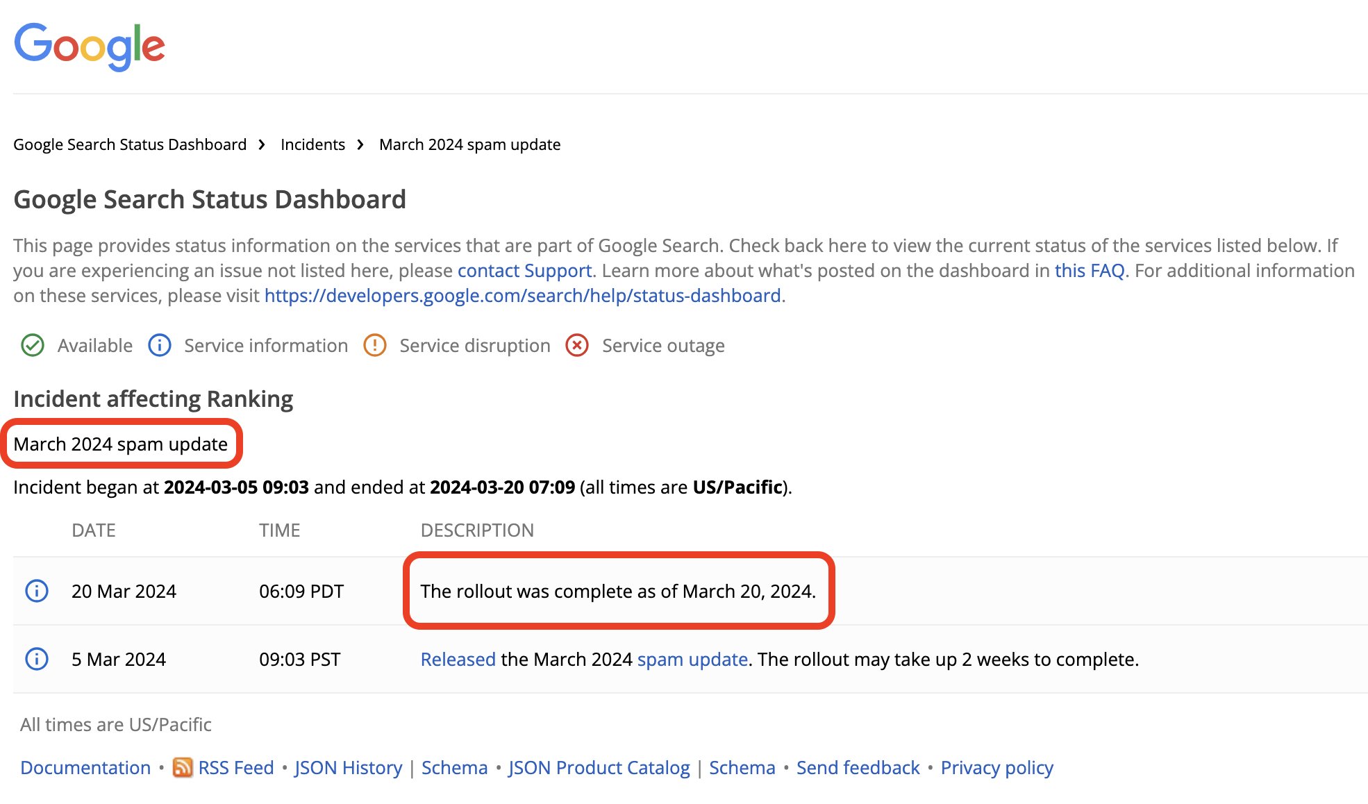 最新情報2024年3月5日に開始されたコアアップデート&スパムアップデートですが、Google Search Status Dashboardを確認したところ、3月20日にスパムアップデートが完了したようです。ちなみにコアアップデートはまだ継続中です。全て完了するまで約一ヶ月かかる見通しとのことなので、4月上旬に完了すると思われます。