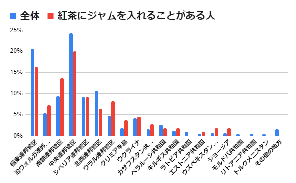 赤が「紅茶にジャムをいつも入れる+たまに入れる」人(110人)の出身地の割合。