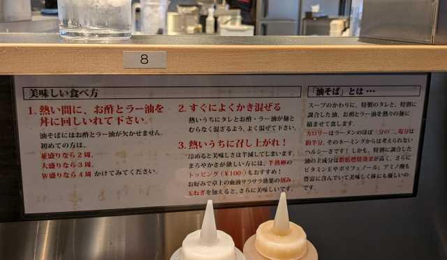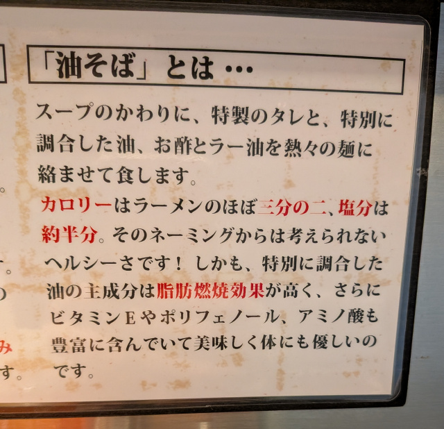 結論になりますが、約30年ぶりに食べた油そば。美味しいには美味しいんですけど、私的にはやっぱりスープに入った普通のラーメンがいいなと。着丼して最初にすするスープの一口。そして麺やトッピングを食べ終わったあとにもう一度すする一口。あれがいいんですよ。風情があって(笑)