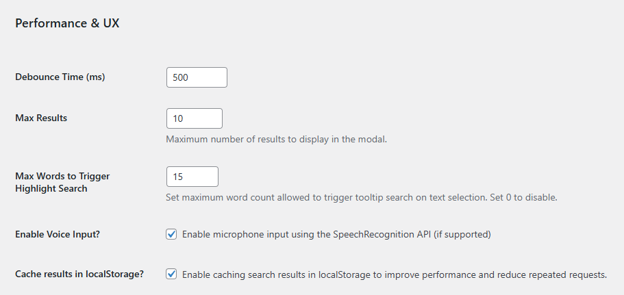 - Set debounce time and max results