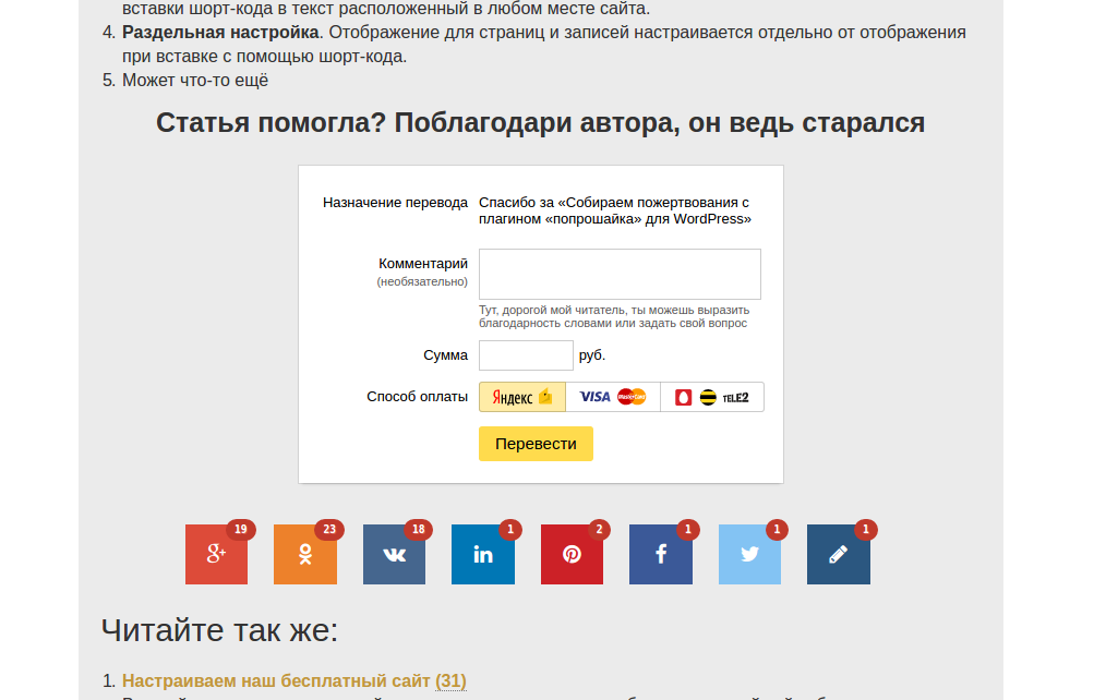 Благодаря этому плагину вы получаете весьма гибкий инструмент, который имеет достаточно большой спектр настроек как внешнего вида так и дальнейшей работы сервиса с пользователем после того, как он перейдет к оплате. Основным предназначениям данного плагина является сбор пожертвований, что и определило его название, но в процессе разработки плагина были выявлены его более широкие возможности, поскольку плагин позволяет организовать торговлю без привлечения более сложных инструментов, таких как интернет-магазин.