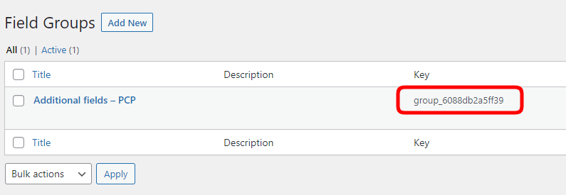 You can find the field group’s key in Custom Fields >> Field Groups dashboard.