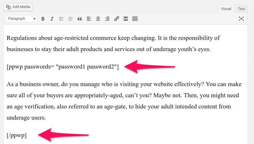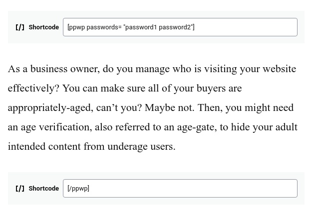 [ppwp passwords="password1 password2" label=""] Your protected content [/ppwp]