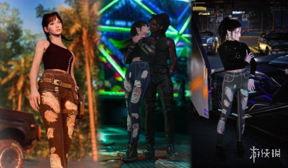 《赛博朋克2077》破洞牛仔裤MOD采用4K级纹理渲染技术,精准还原丹宁面料的粗糙颗粒感与做旧痕迹,裤身破洞边缘的毛边纤维清晰可辨,膝盖、大腿等易磨损部位的褪色效果自然过渡,搭配水洗蓝、炭黑、烟灰三种经典底色,避免塑料质感的违和体验。