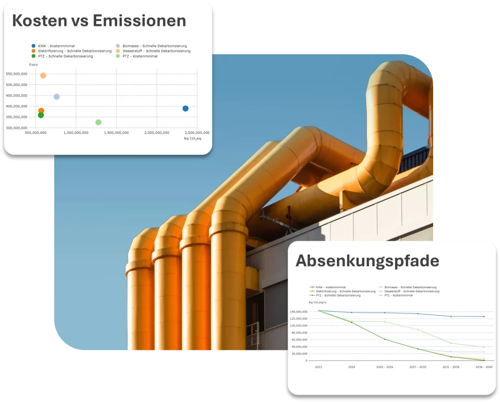 Unsere Algorithmen durchsuchen Ihren Lösungsraum, balancieren Emissionen, Capex und Opex und unterstützen Sie bei der Ableitung von Strategien für einzelne Standorte bis hin zur ganzen Unternehmensgruppe.