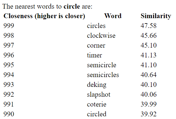 Another example is last day’s solution (15 March 2022), when the secret word was circle. The ten closest words you could have guessed include circles and semicircle, but more distinctive words such as corner and clockwise.