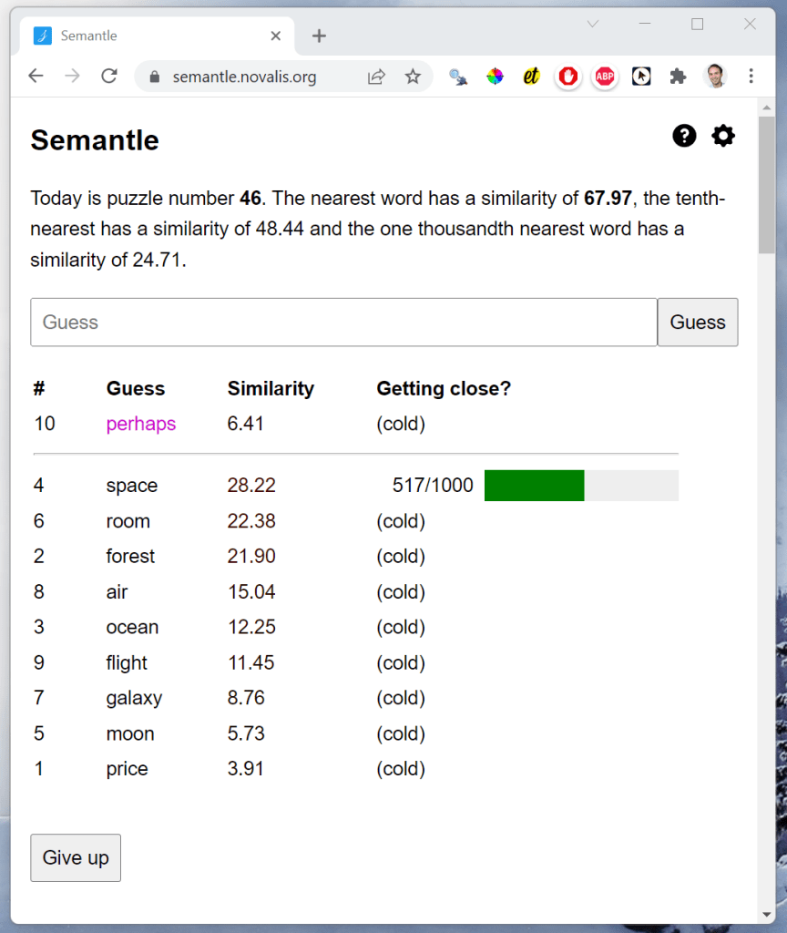 Now, every day, one word is randomly selected as the secret word, and you can try to guess which one it is. I usually give up after 300 to 400 guesses, but my record was 76 guesses for uncovering the secret word world.