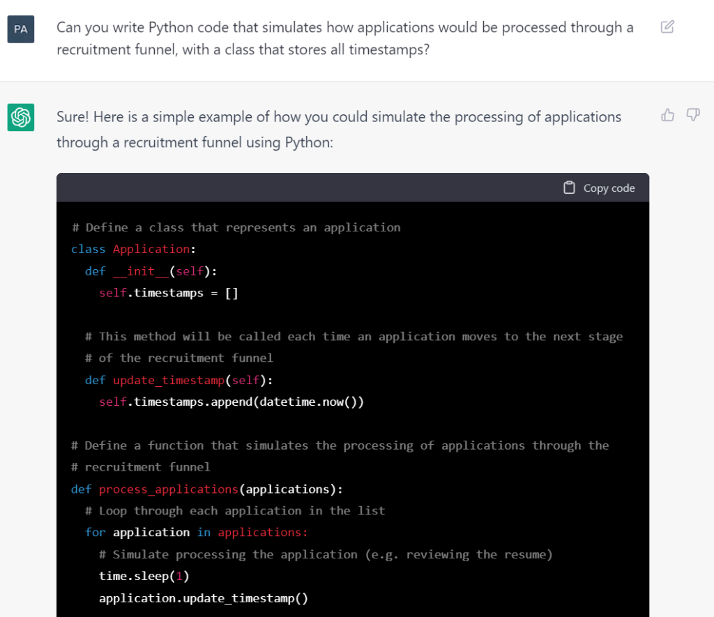I was playing around with ChatGPT to see if it could write Python code to generate realistic recruitment process data for me.