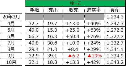 ゆーこ:+13.3万円(貯蓄率42%)