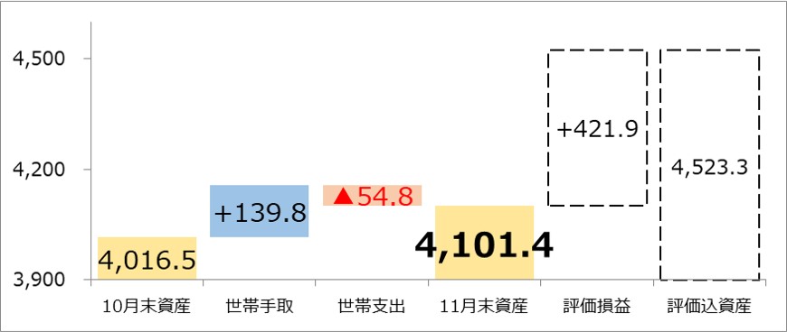 上記を受け、22年11月末の資産は4,101.4万円となりました (除く、評価損益)。