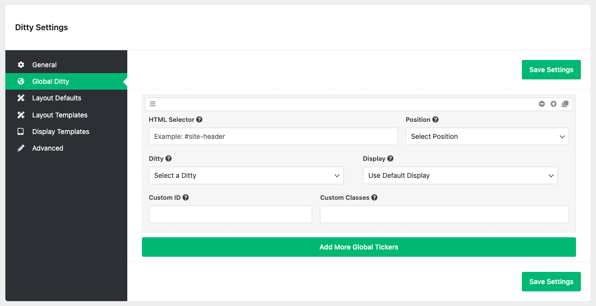 Easily add your Ditty globally on your site, anywhere, without modifying theme files. Want a ticker scrolling at the top of your site, no problem!