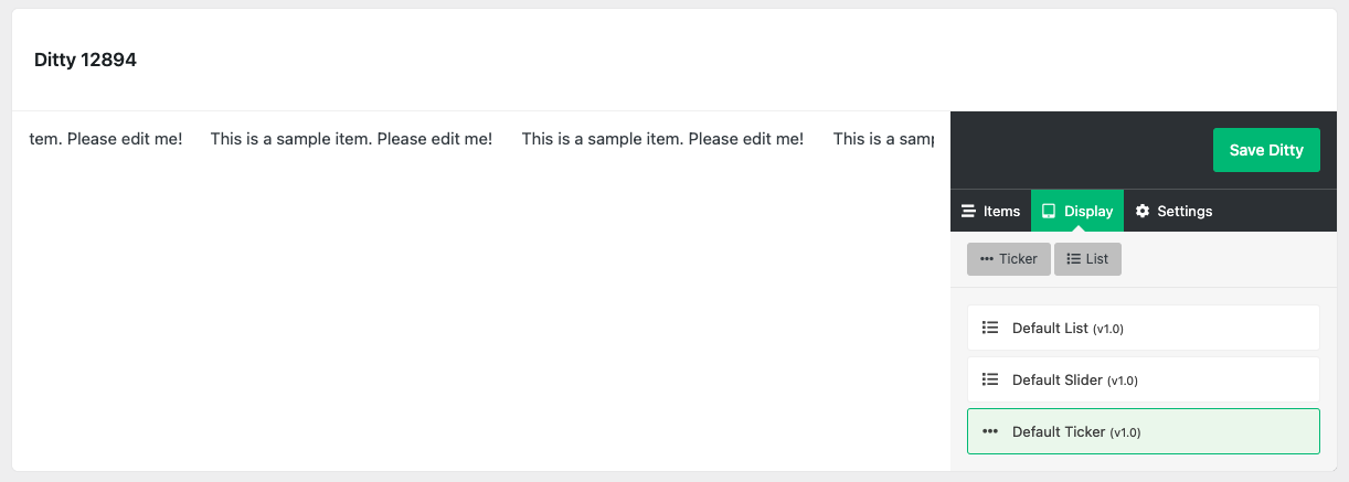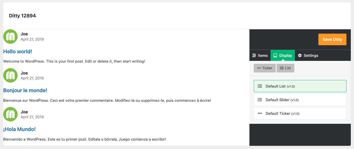 Ditty, formerly known as Ditty News Ticker, is a multi-functional content display plugin for WordPress while still offering its signature «News Ticker» functionality. Effortlessly showcase your latest blog posts or custom content through multiple display options, including the classic News Ticker, Slider, and List. Enhance your site by adding more content sources and display options through extensions, enabling you to present RSS feeds, social media, image galleries, custom post types, and more through the included displays or additional display extensions like grid and carousel. Discover the enhanced capabilities of Ditty while maintaining its prowess as a reliable «News Ticker» solution.
