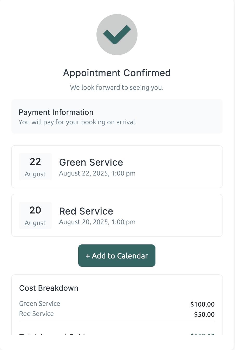 - Multiple appointment bookings (Cart): simplify scheduling by allowing customers to book multiple services or appointments at once and complete them in a single, hassle-free checkout.