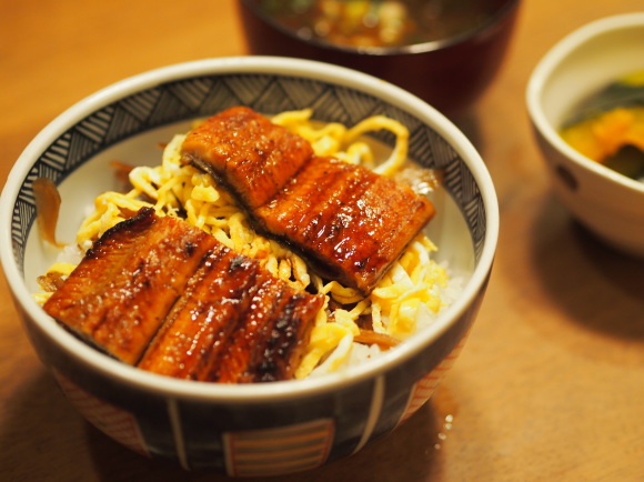ささがきゴボウを炒めて鰻のタレで味付けした物と錦糸卵をご飯の上に乗せてから鰻を