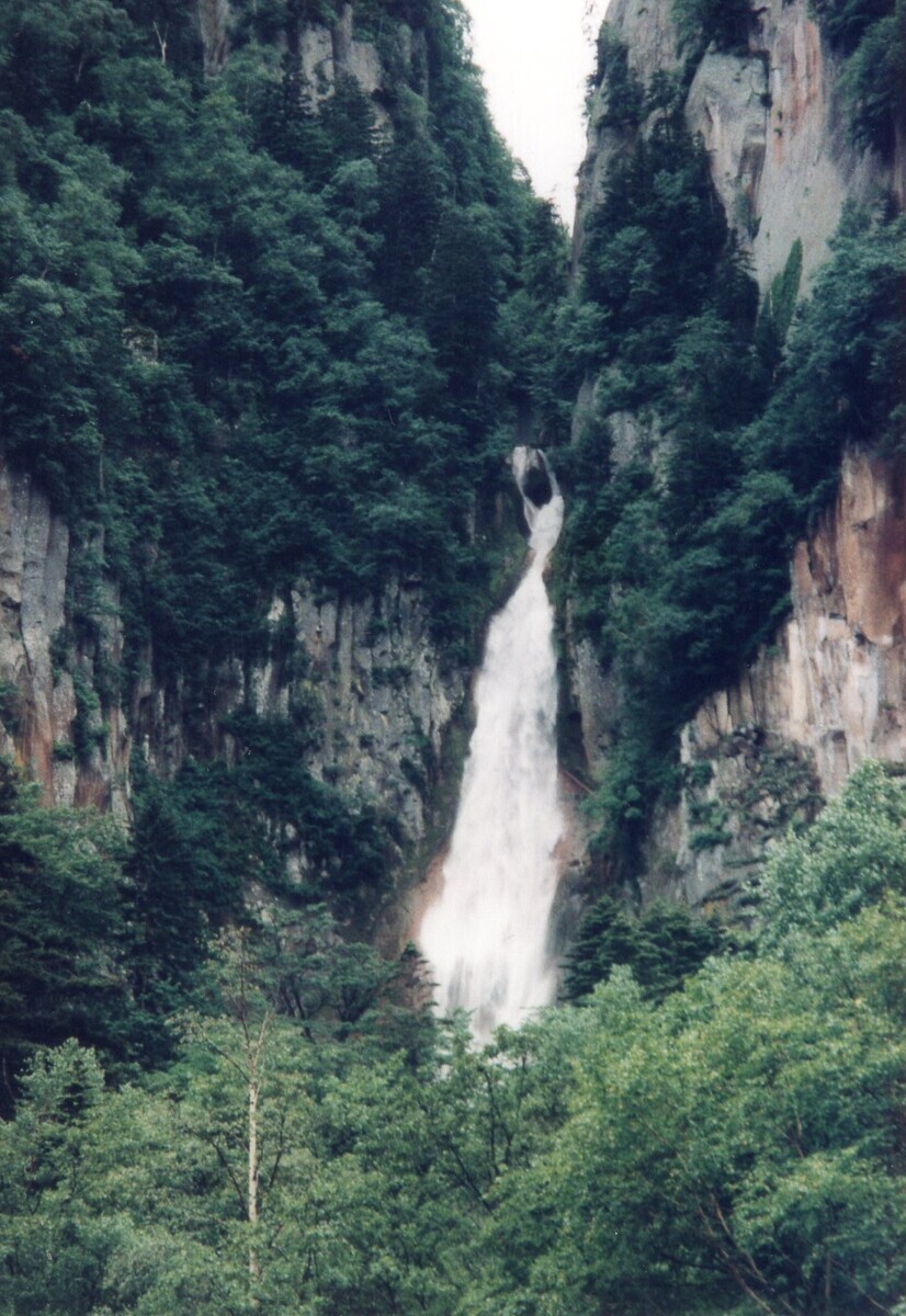 まず視界に飛び込んでくるのは、鋭く天を突くようにそそり立つ岩の峰の間から流れ落ちる「流星の滝」と「銀河の滝」。北海道の屋根と言われる大雪山系の沢水が水の柱となって豪快に落下するのが「流星の滝」で、天女の羽衣のように岩肌を滑り落ちるのが「銀河の滝」だ。歴史の浅い北海道らしい安直な名前だが、どちらも見事な滝ではある。