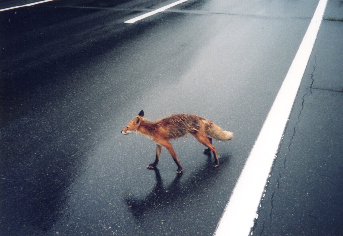 しばらく行くと、またキツネが出てきた。自転車を停めると、こちらへやってくる。人間に餌をもらうことを覚えたのか、大胆な奴だ。小柄だから子ギツネらしいが、すぐそばまで寄ってきて、人を恐れる様子も見せずに、びしょ濡れになった体をブルブル震わせている。