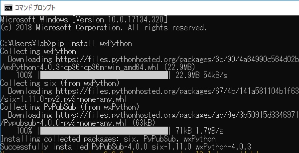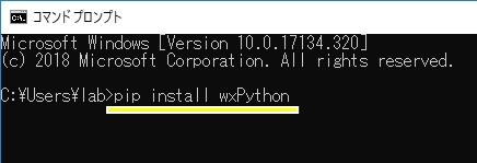 コマンドプロンプトに「pip install wxPython」と入力するだけです。最後にエンターキーをおします。