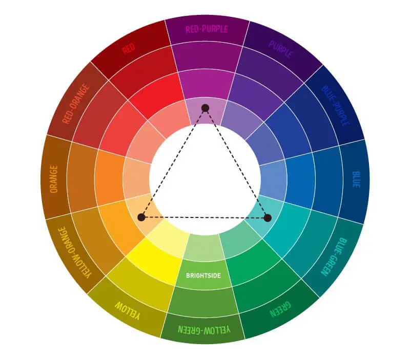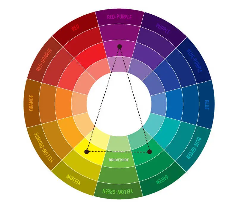 3色・トライアド配色(英: Triad)は、カラーホイール上の等しい距離にある3色の組み合わせを指します。うまく調和の取りつつ、強いコントラストを表現することができます。たとえ色相の低い色でも、鮮やかな配色を実現できる組み合わせです。