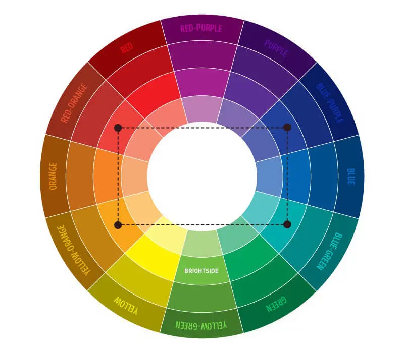 テトラード配色(英: Tetrad)は、カラーホイール上を四等分する位置の色を利用した配色を指します。メインカラーに2つの補色、アクセント用1色を加えた、合計4色の組み合わせです。もともと「テトラ」とは、ラテン語で4のことを意味していることを覚えておくと分かりやすいでしょう。