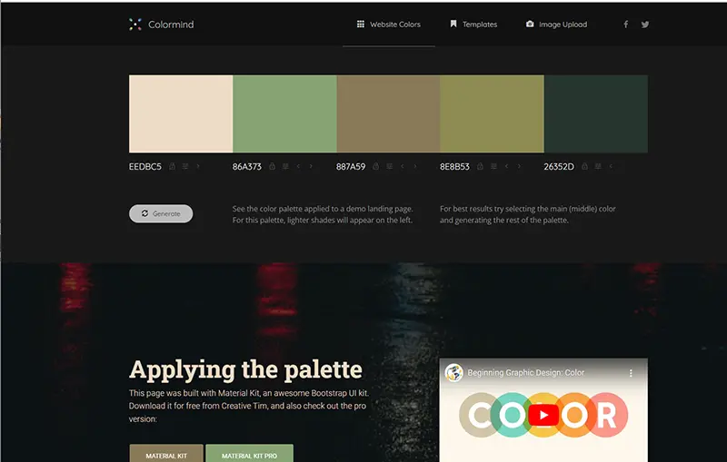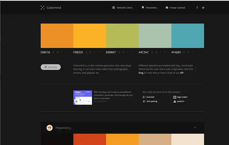 写真や映画、人気アートからカラースタイルを学習させた、AI活用の配色ジェネレーターColormind。「Generate」ボタンをクリックするたびに美しい配色が生成されます。