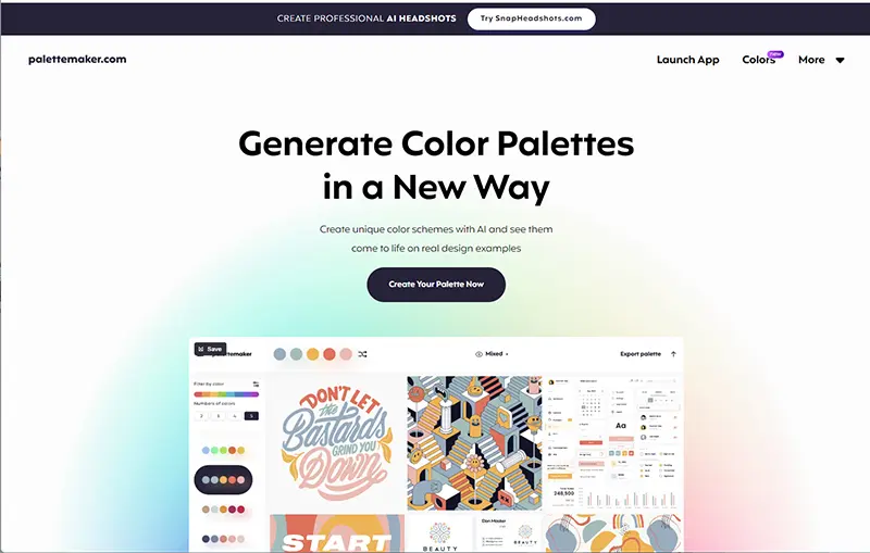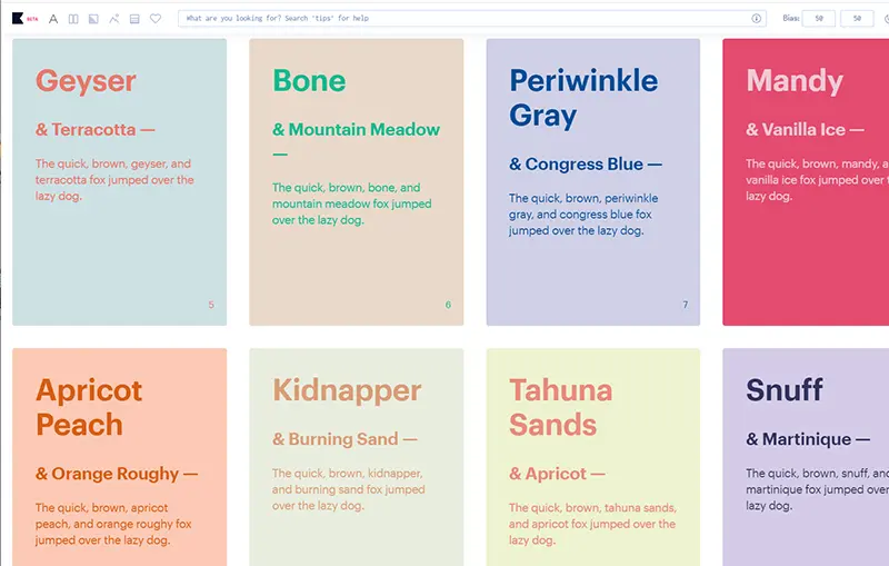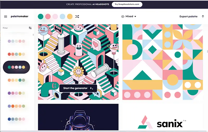 お好みの配色をクリックで選ぶだけで、大量の制作サンプル例で色味を確認することができるPalettemaker。本当に必要なカラーパレットを直感的に選ぶことができます。