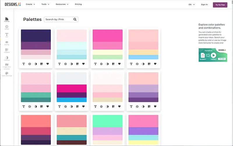 手持ちのイラストをアップロードすると、瞬時に異なる配色カラーパレットで色付けしてくれ、ページをスクロールするたびに新しい配色をAIが提案してくれます。