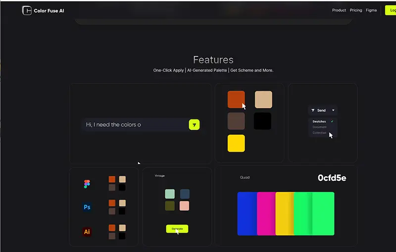 チャット形式で欲しい配色を尋ねると、AIが適切な色を提案してくれ、Illustratorなどのデザインツールに色をワンクリックで適用できる(有料オプション)ツールColor Fuse AI。