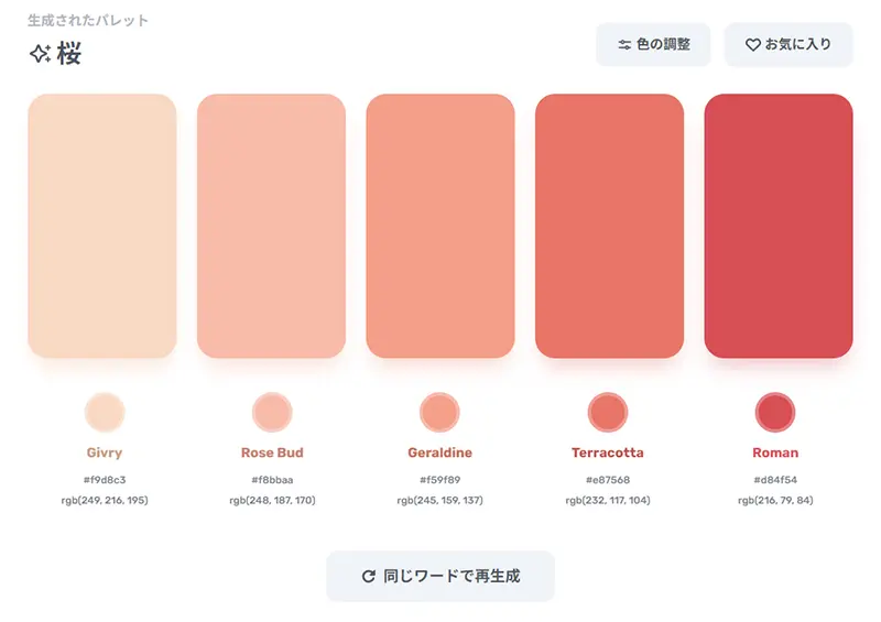 続いて「桜」で生成したカラーパレットがこちら。ピンク色の美しいグラデーションカラー。
