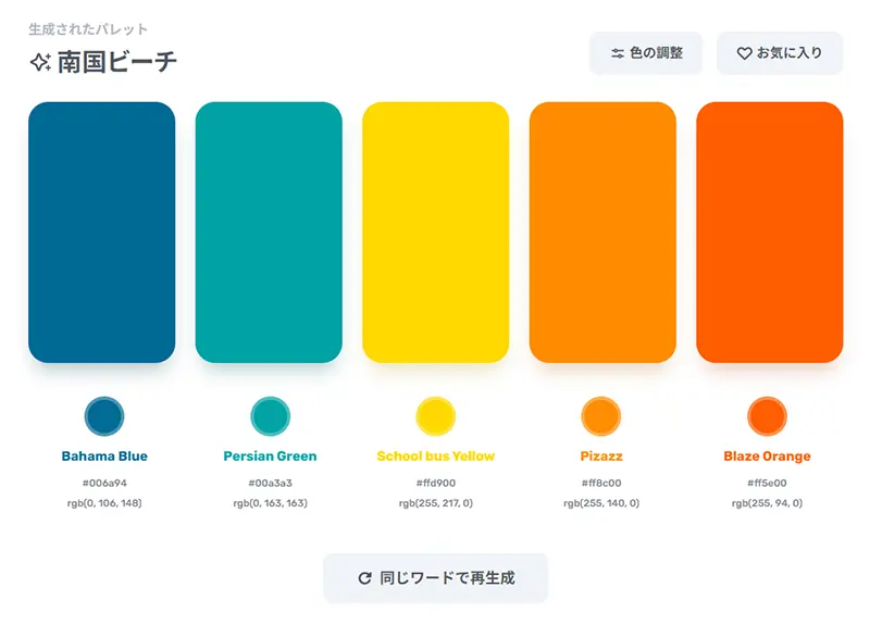 「南国ビーチ」というワードでは、活発な雰囲気のカラフルな配色が。とにかく配色が美しくて使いやすいのが、このツールの特長。