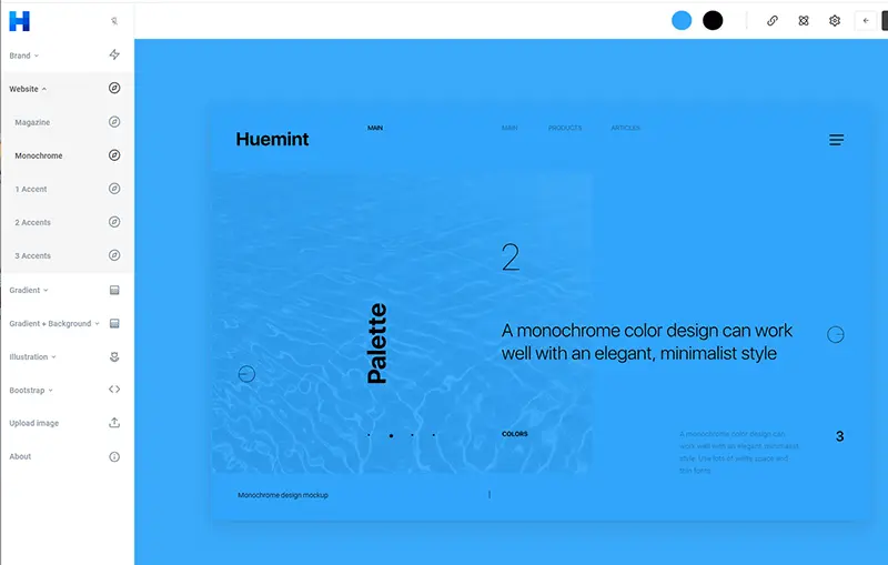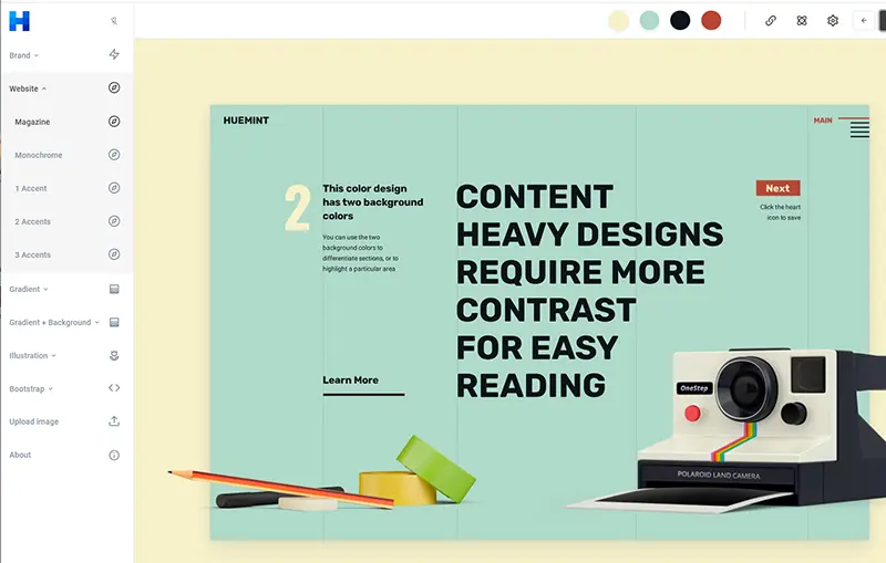 人工知能テクノロジーを駆使し、プロジェクトにあった配色を自動で提案してくれるツールHuemint。色の組み合わせを確認できるサンプルイメージが豊富。