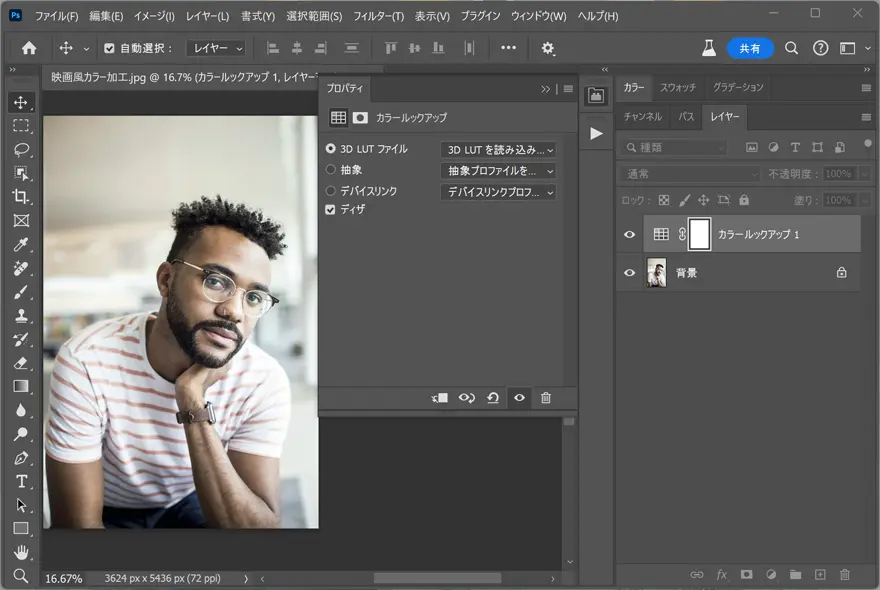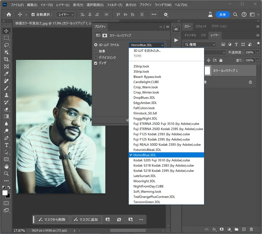 プロパティパネルより「3D LUT ファイル」から「HorrorBlue.3DL」を選びます。