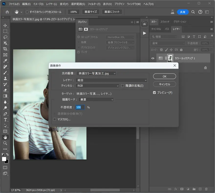 「カラールックアップ」レイヤーのレイヤーマスクを選択した状態で、メインメニューより「イメージ」>「画像操作」を選択します。