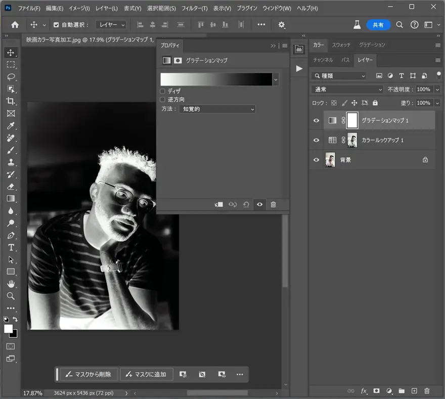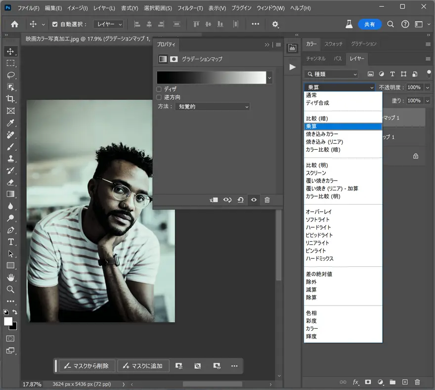 あとはグラデーションマップレイヤーの描画モードを「乗算」に変更。不透明度を「50%」ほどに下げれば完成です。