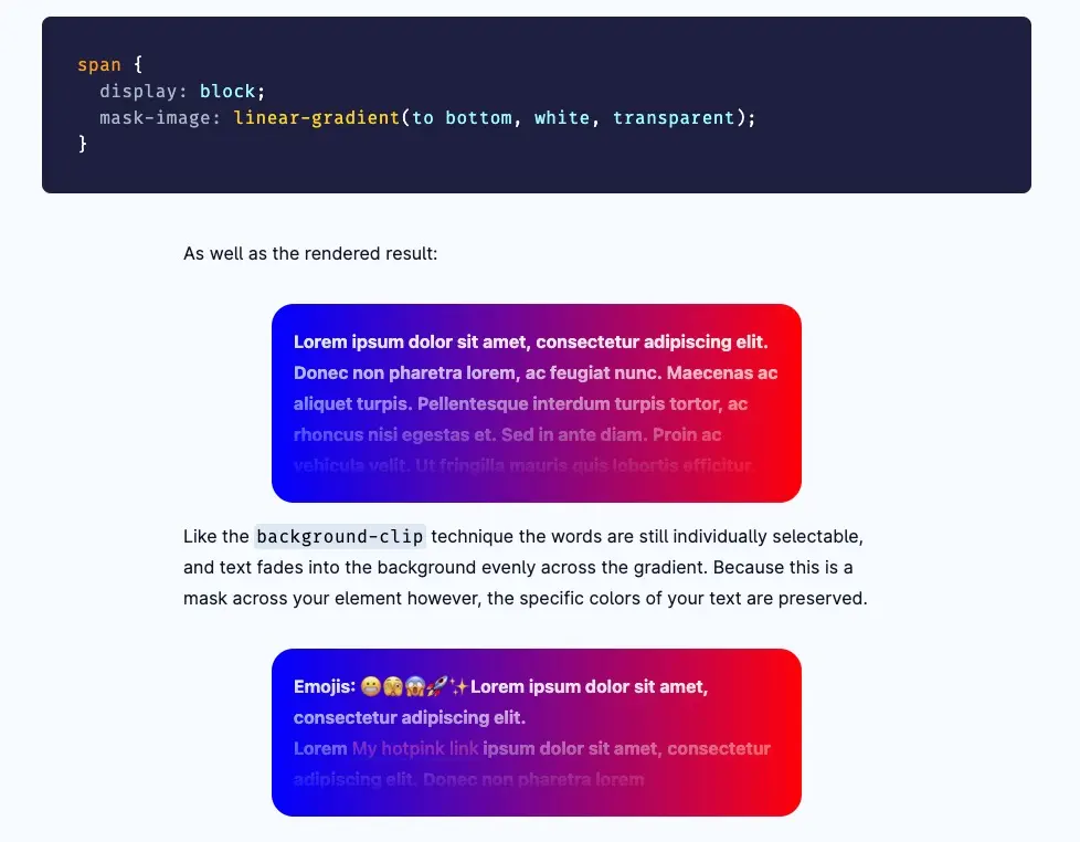 参考記事: My take on fading content using transparent gradients in CSS | Polypane