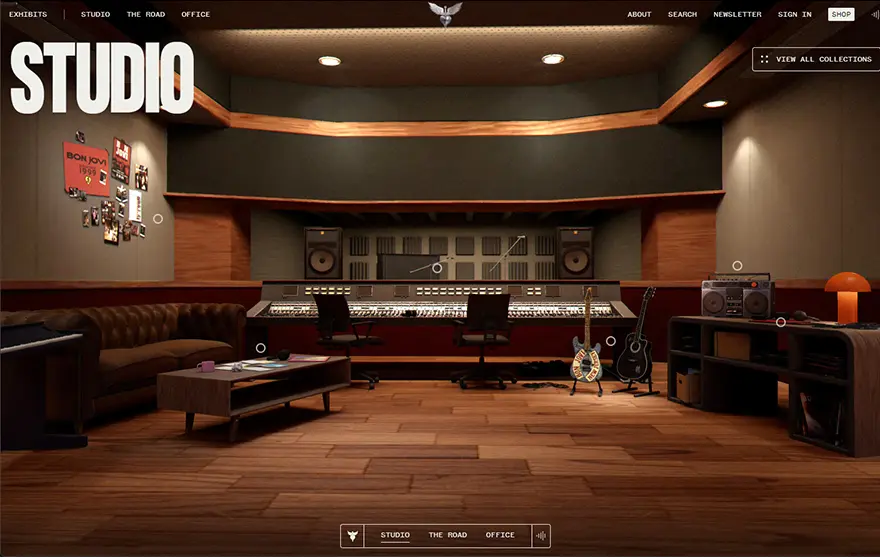 世界的な大物アーティストBonJoviのバックステージを詳しく探検できる体験型Webサイト。スタジオやツアーの控室、オフィスなど視線を変えながら楽しむことができる。
