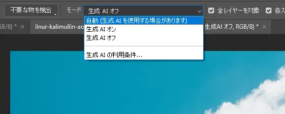 「自動」に設定おけば、フォトショップが生成AIを利用するか自動で判断してくれるのでオススメ。