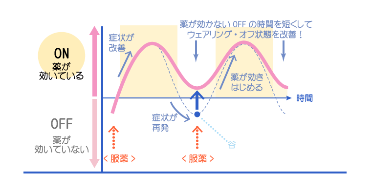 抗パーキンソン病薬による薬物治療の効果は数年間は安定しているが、経過とともに、薬の効果が短くなるwearing-off現象や、内服した時間に関係なく症状が良くなったり悪くなったりするon-off現象がみられるようになる。