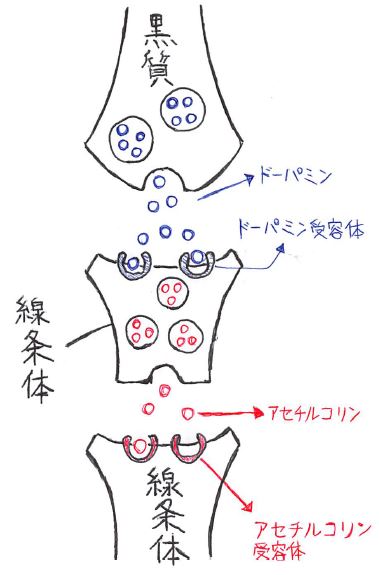 黒質から分泌されたドーパミンを、線条体の「ドーパミン受容体(ドーパミンの受け皿)」で受け取ることで、線条体からアセチルコリンが分泌量が調整される。