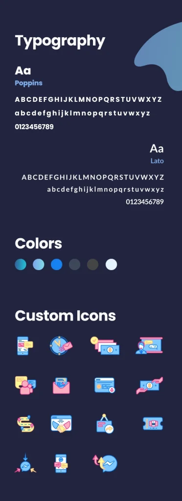 To match with their brand, we chose Poppins and Lato for the type and gradients of blue as the primary colors. We introduced contrasting tints and shades to the color palette to complement the primary colors. Our illustrator designed custom icons to be used throughout the website to convey their message easily.