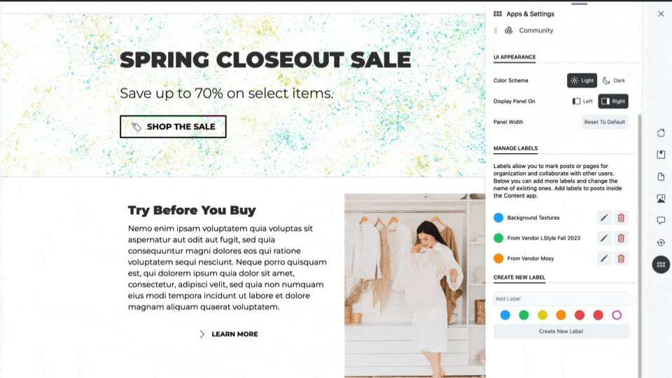 - Add Code App that enables you to create and edit CSS and JS code snippets, which you can assign to different sections of your website.