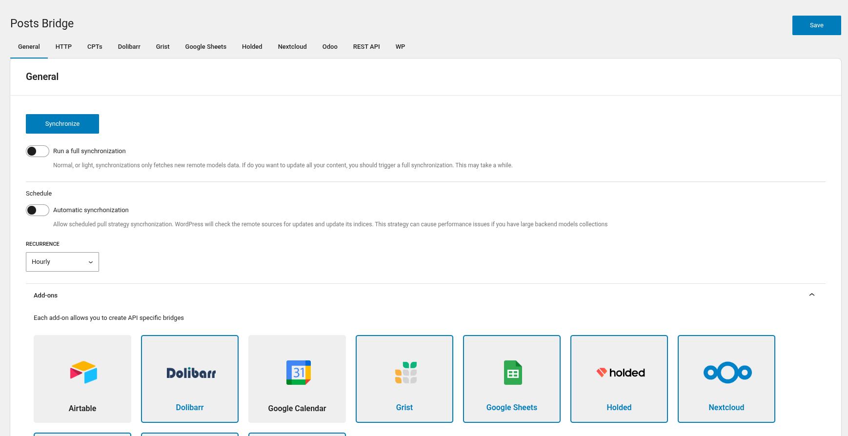 Posts Bridge comes with free add-ons. Each add-on add to the plugin new bridges to work with specific APIs.