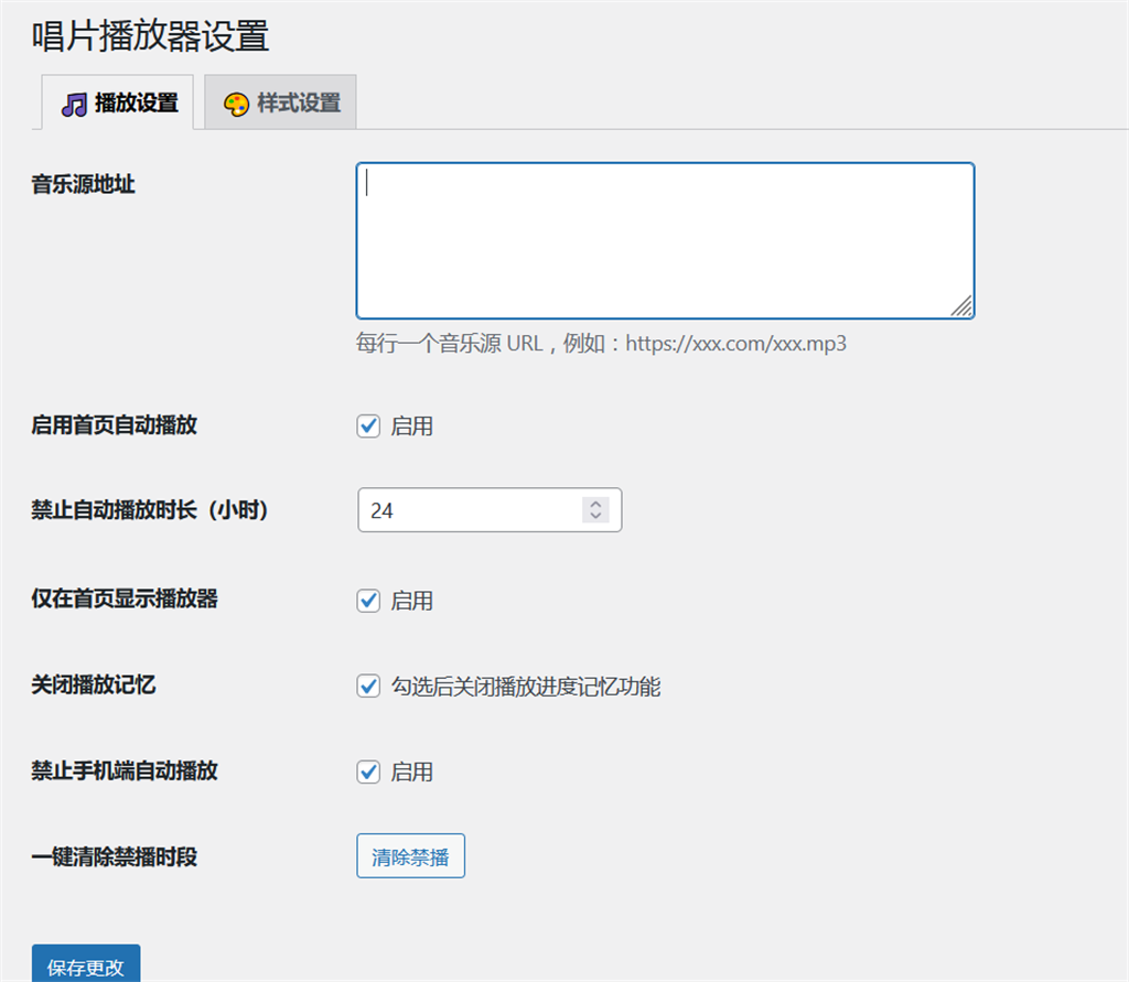 在设置页的“音乐源地址”文本框中,每行输入一个 mp3 链接,插件将自动随机播放。