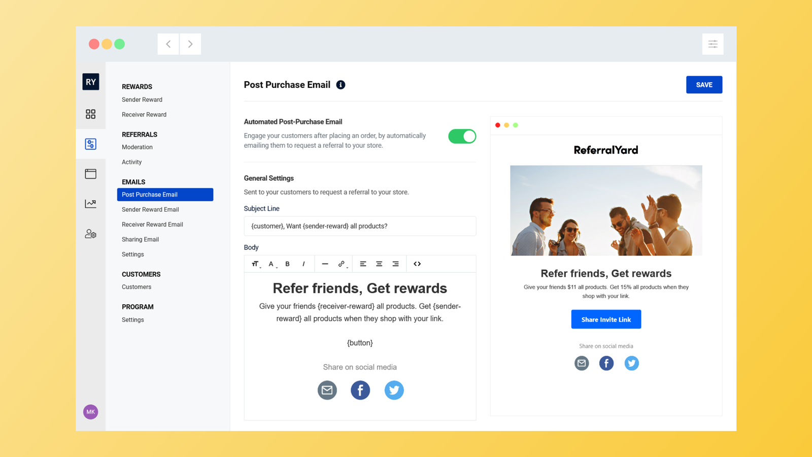 ReferralYard is a highly customizable Referral platform designed to help stores grow their sales through Referral Marketing, through multiple channels like SMS, Emails, Social Media, and more!