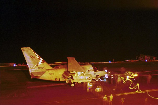 Apart from aerial tanker duties, these Vikings flew most of their patrols to survey the Persian gulf, in order to track what few warships Iraq had, and to mark the location of mines. Some Vikings were also involved in the search for Iraq’s short range Scud ballistic missiles, a great fear at the time being that some of them may have carried chemical weapons payloads. They also performed a number of unorthodox tasks. For instance, the US carrier air groups could not electronically receive their daily air tasking orders from the coalition headquarters in Riyadh, Saudi Arabia. Their solution was to dispatch an S-3B to pick them up on a near daily basis. Among the most imaginative uses of the aircraft was in delivering photos from carrier based reconnaissance services to units fighting on the ground. This was done by placing the photos in an empty sonobuoy tube and parachuting them to units. One Viking also sank an unidentified class of Iraqi patrol ship on February 20, 1991, after dropping three unguided mk82 bombs on it. Offensive patrols were comparatively restricted and were conducted in areas with limited anti-aircraft threats.