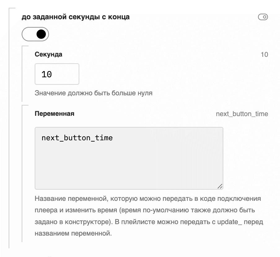 Теперь элемент должен показываться за 20 секунд до конца воспроизведения. Это время можно также задать в коде с помощью своей переменной: